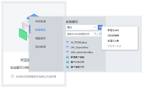鹏为BI支持从数据源、创建SQL数据集、资料库3种方式添加