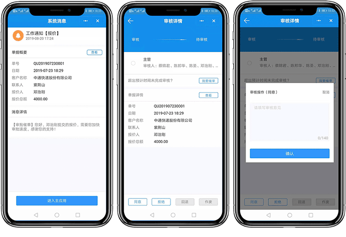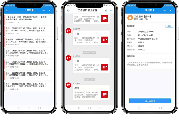 在CRM中设置的审批流程,通过消息机制推送至钉钉APP,在
