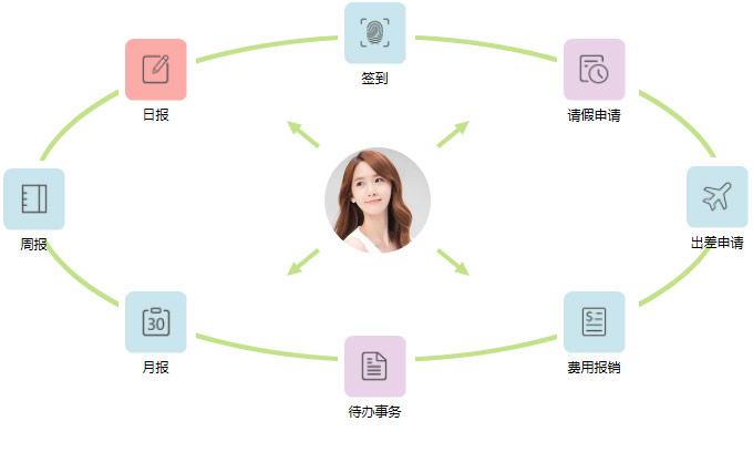 员工可以通过平台可快捷的进行请假、出差、报销、动态等一