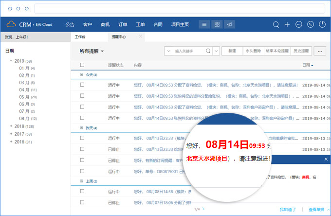 票客户等进行实时预警或提醒,将员工人找事变为事找人,提