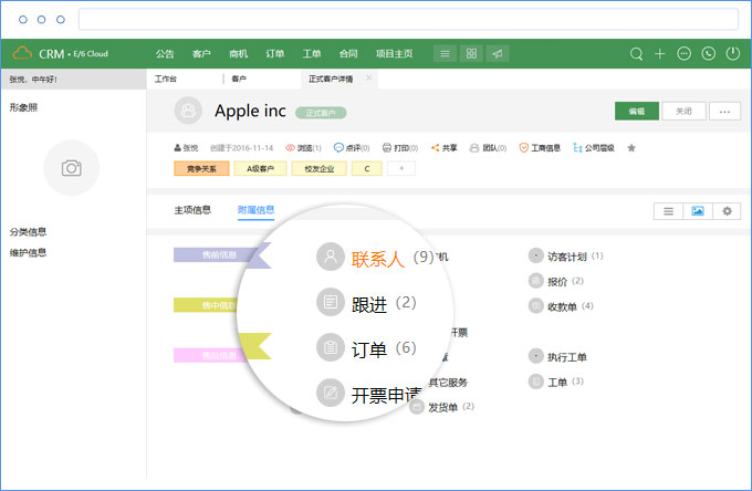 跟进、报价、订单、合同等全过程。通过附属模块进行拖拉拽的快