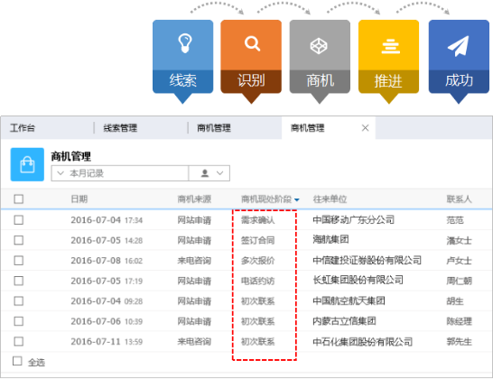 鹏为E/5提供了售前管理的标准应用,动态阶段过程管理有效融入,大幅度提升嬴单率,过程管理成就结果