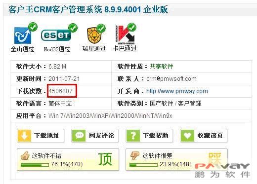 1.精简版:http://www.pmway.com/product/haohua.htm 2.企业版:http://www.pmway.com/product/Enterprise.htm 3.豪华版:http://www.pmway.com/product/Personly.htm 企业实施CRM难题 客户王优点 1 前期资金投入多、实施难度大 价格实惠,性价比高,支持软件使用; 2 企业必须选择符合自身需求的crm,不然导致前功尽弃; 功能齐全,经过多年实施检验,可以适应多种行业需求; 3 前期数据导入麻烦,员工不愿学习; 数据支持excel导入导出,操作简单,易学易懂,员工学习成本低; 4 担心软件升级能否跟得上企业的发展; 软件免费升级,版本切换便利,有专业人员指导操作,后期可顺利切换成网络版。保证数据安全。 5 要为售后服务花费担忧,问题却不能有效解决; 提供免费售后咨询,一对一远程解决使用难题。