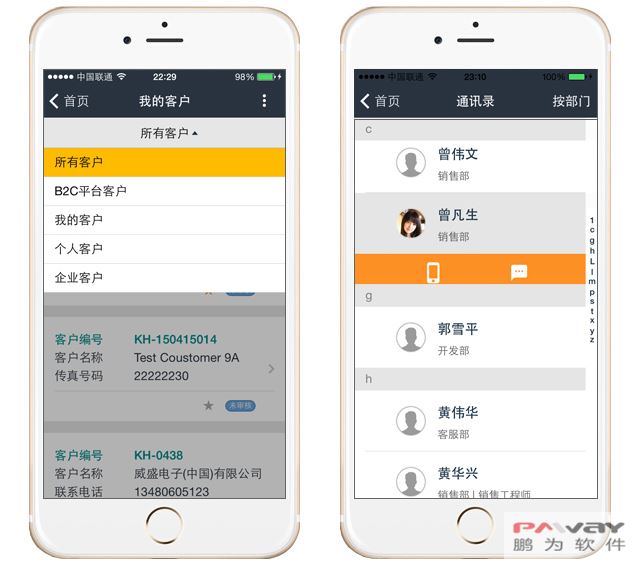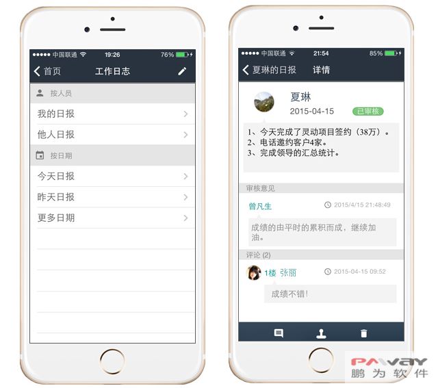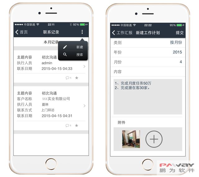 基于鹏为E4产品的移动APP应用2.0 IOS版本,实现手机端与PC端差异化协同办公使用,以“移动办公+CRM”为核心,连接移办公管理、CRM应用,让传统企业实现移动互联网办公转型,大幅度提升企业经营管理效率。