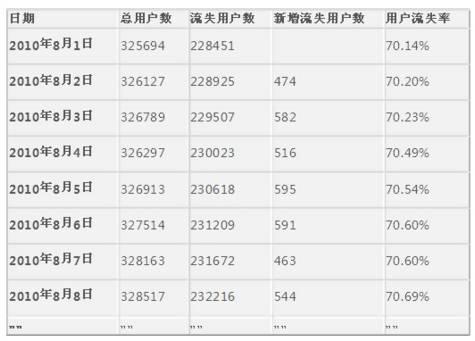 首先需要明确的是用户的流失可能并不是永久的,也许用户在一段时间内对网站确实没有任何需求,那么他会远离网站一段比较长的时间;或者流失用户也会因为网站的某次营销或者网站质量的改善而重新回来。网站总的流失用户数的计算比较简单,以超过1个月内登录即为流失为例,那么总流失用户数就是所有“当前时间点-用户最近一次时间点>1个月”的用户数量。但是单纯的总流失用户数量对于分析是没有意义的,因为大部分情况下这个数值是一直递增的,我们需要计算总流失用户数占总用户数的比例及新增流失用户数,观察它们的变化趋势,如下表:
