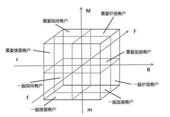 以上三个指标会将维度再细分出5份,这样就能够细分出5x5x5=125类用户,再根据每类用户精准营销……显然125类用户已超出普通人脑的计算范畴了,更别说针对125类用户量体定制营销策略。实际运用上,我们只需要把每个维度做一次两分即可,这样在3个维度上我们依然得到了8组用户。