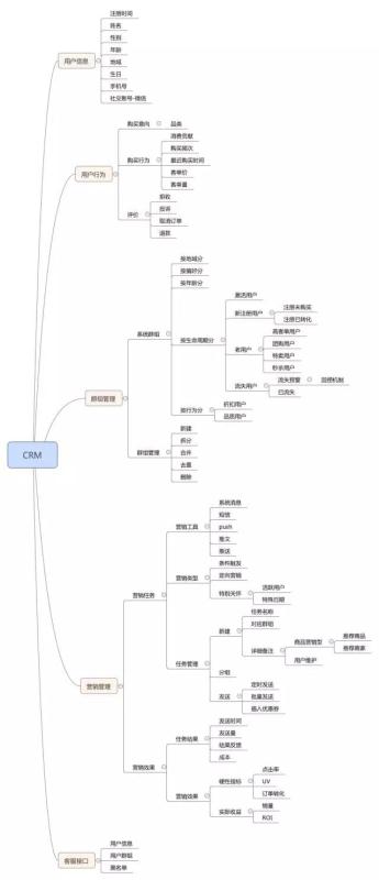 结合用户生命周期和价值,观察流失率曲线并预估是否用户在持续累积还是流失,评估用户的RFM,在了解了用户的真正节点之后,结合数据,就可以设计搭建CRM大后台了,这个后台所要承载的功能就需要按照模块进行分类和细化,这里只对大模块做区分,并没有细化用户的生命周期节点,后台可留有时间设置,来进行精准营销,这个相信大家都明白怎么样去利用数据设置任务,此处不做赘述,具体内容可参考下图,基本可以覆盖电商所需要的底层功能: