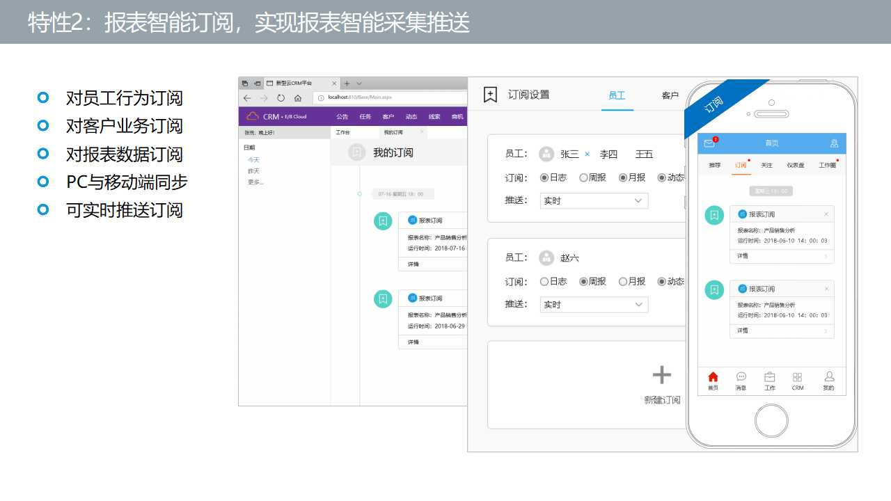 E/8 Cloud平台引入订阅概念,使得中高层团队或是领导老板按需订阅自己所需数据,系统自动推送提醒。可实现针对员工行为数据订阅、核心客户业务数据订阅,重要报表数据订阅,PC与移动端同步,大幅度提升领导实时获取关键性数据的效率。