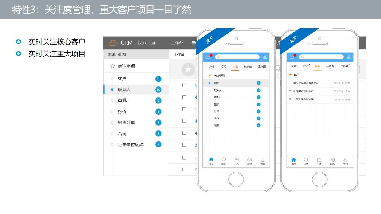E/8 Cloud平台针对关注度管理进行了优化与提升,企业各级人员关注的核心客户或项目都不一样,不同的人员可以根据自己的岗位特性定制自己关注的客户或项目,无需深入系统各个模块,即可实时查看自己的关注管理。