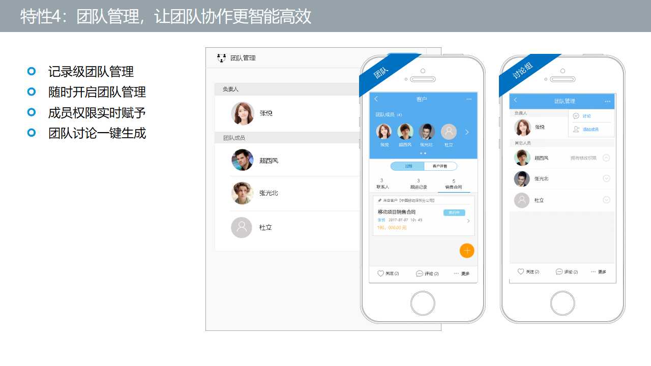 E/8 Cloud平台引入了团队管理的理念,针对全系统记录级数据可启用团队管理,针对业务开展的实际情况,可随时开启团队管理,实时赋予成员权限,团队成员即可实时通知加入团队成员,团队讨论组可一键生成即时通讯。