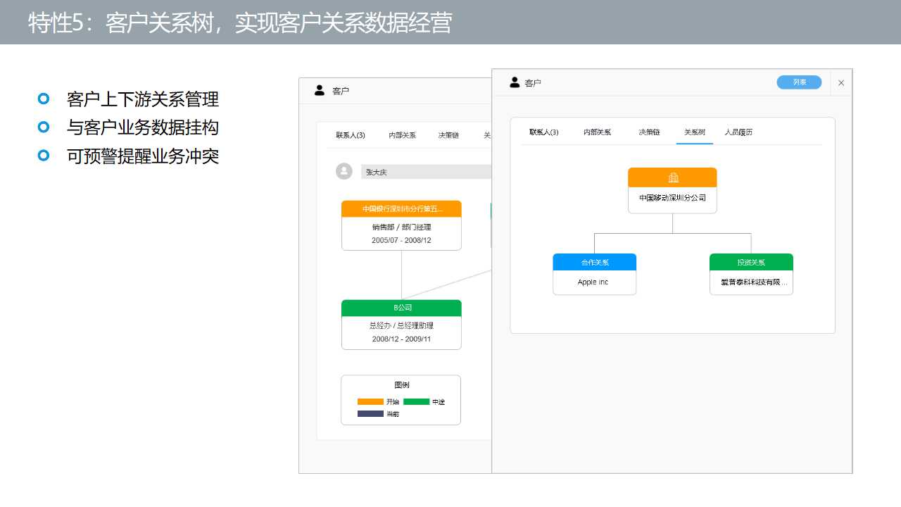 E/8 Cloud平台重塑客户关系树应用场景,实现客户上下游关系管理,与关联客户业务数据挂构,当关联客户发生业务时,系统可实时预警提醒业务冲突,有效避免业务冲突。