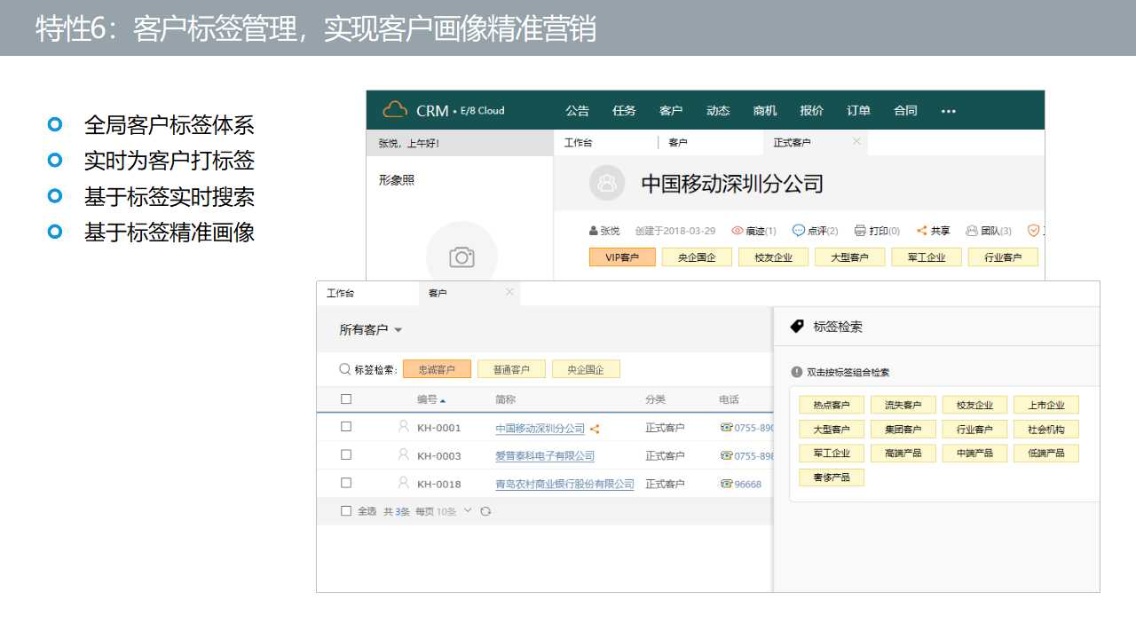 E/8 Cloud平台引入了标签管理,全局标签体系应用,按需开启:可实现客户标签、渠道标签、产品标签、合同标签等,实时为相关业务打标签,同时可基于标签实时及组合搜索,洞察精准业务画像。