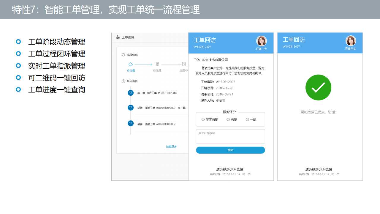 E/8 Cloud平台引入了智能工单管理,可实现工单阶段动态管理,从工单的实时指派,到工单池以及工单全过程闭环管理(工单按受、工单执行、工单完成、异常工单),工单回访支持手工回访与二维码一键回访,支持工单进度一键查询。