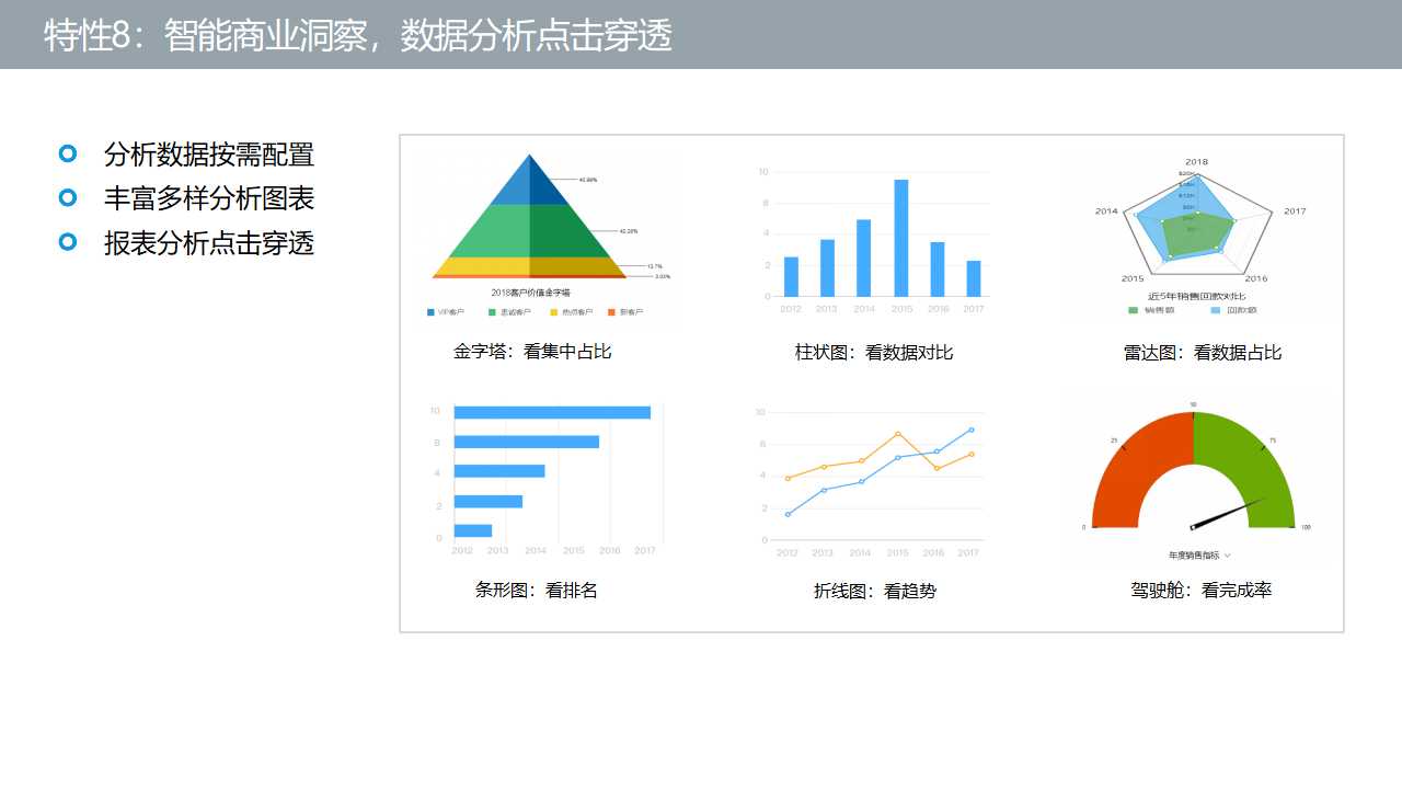 E/8 Cloud平台的决定分析组件进行了重点优化与升级,分析数据按需配置,支持五种分析模式(简单模式、复杂模式、组合模式、同比模式、环比模式),每个分析报表支持丰富多样的图表类型(多达9种格式),分析数据支持穿透、反向数据跟踪与查询。