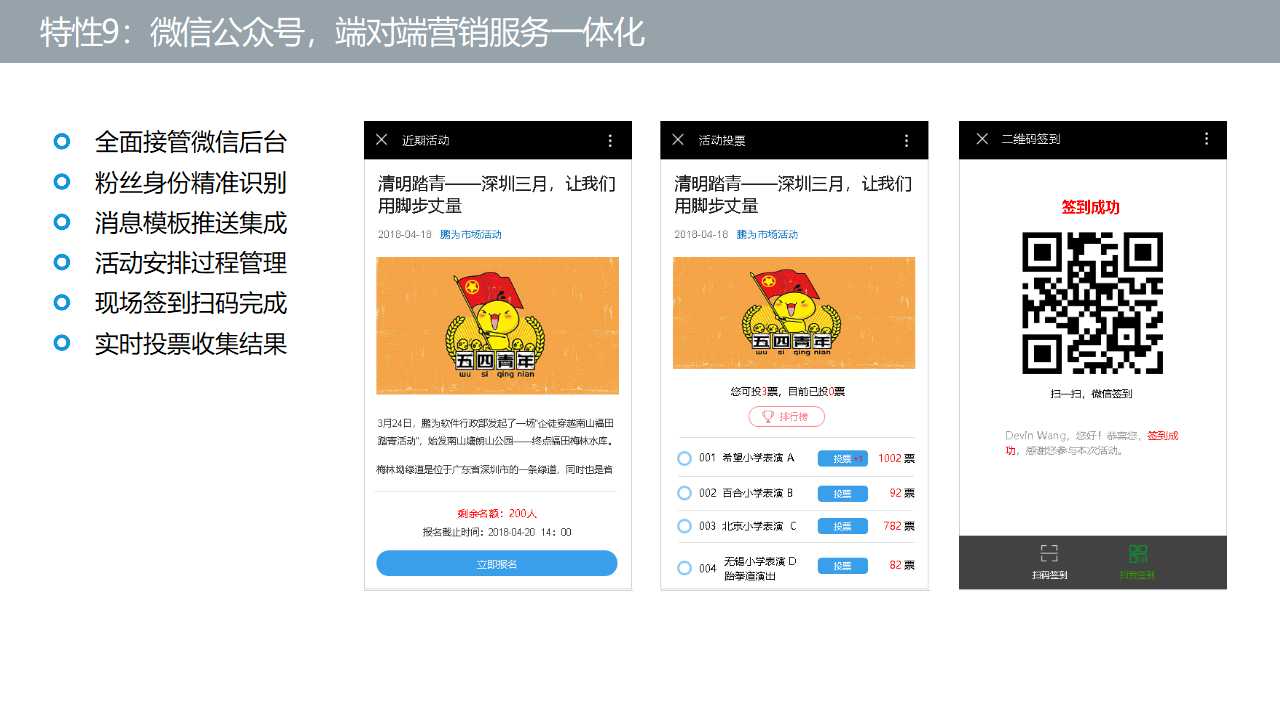 E/8 Cloud平台集成了微信公众号应用,全面接管微信后台,粉丝客户身份精准识别与CRM实时同步数据,微信公众号消息模板精准推送,在CRM系统即可进行活动全过程管理(活动报名、扫码签到、实时投票、LBS定位)。