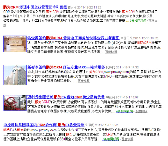 鹏为软件凭借多年丰富的CRM研发实战经验,优秀专业的技术、服务以及营销团队和成熟齐全的产品线,获得国内30000多家中小企业的青睐。尤其是近年研发的E4系统(在线型CRM),更是成为众多知名企业的首选CRM。如长虹集团(多元化综合型企业)、中控科技(生物识别企业)、李阳疯狂英语(教育培训业)、鲁信药业(医药企业)、锐明视讯(数字监控行业)、弘大集团(机电产品制造业)、清华紫光(综合性校办企业)、钻宝源(珠宝行业)、捷甬达(机床制造业)、易捷通(POS行业)等等,先后与鹏为E4顺利签约。