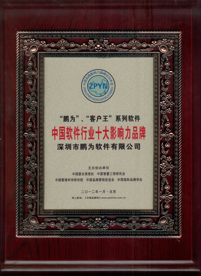 鹏为软件继2011年荣获了“中国软件行业用户满意品牌”、“十年优秀CRM解决方案奖”等诸多荣誉之后,旗下自主品牌——“客户王”和“鹏为”在2012年伊始喜获“中国软件行业十大影响力品牌”称号。